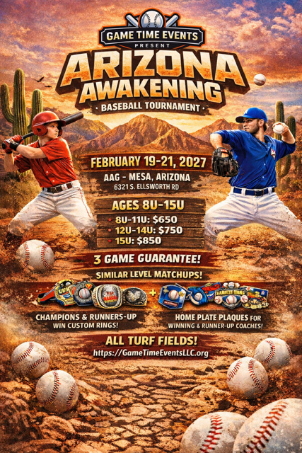 Bring your teams to AAG Fields in Mesa, Arizona February 19-21, 2027 for the Arizona Awakening! Ages will be 8u-15u and open levels. We will match teams to similar levels to set it up for competitive games. All turf fields! There will also be MLB spring training games being played with about 8-10 teams within 20 minutes of this tournament location so teams can check them out! This will be a 3 game guarantee consisting of pool play and bracket, a single elimination tournament. Register to save your spot! Rings will be given to both runner up and champions Bag tags and trading pins will be given to all players Runner up and champion head coaches will also be given home plate plaques Cost: 8u – 11u $650 12u – 14u $750 15u $850 AAG Fields 6321 S. Ellsworth Rd Mesa, AZ