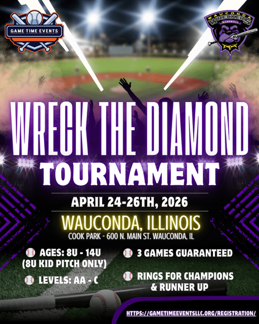 We invite your teams play on April 24th-26th, 2026, and come to Wreck the Diamond! The divisions will be 8u through 14u and levels AA-C. Ages 8u, 9u, 10, and 14u will be limited to 6 teams and 11u-13u will be 8 teams. We will match the similar levels for pool play to set up even levels for competitive competition. There will be three games guaranteed consisting of pool play and a single elimination tournament. Register now to save your spot!