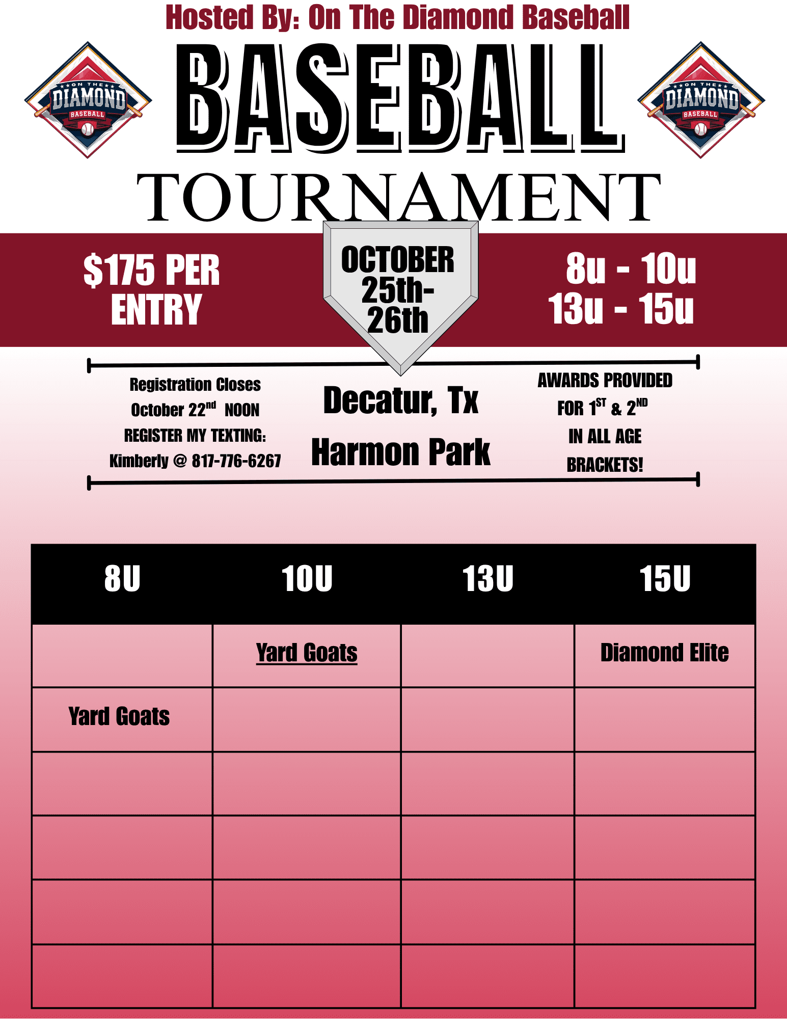 Join us for the On The Diamond Baseball Tournament, a thrilling 2-day event taking place in Decatur, Texas! This tournament will be hosted at two excellent local venues: Harmon Park and Jones Park.