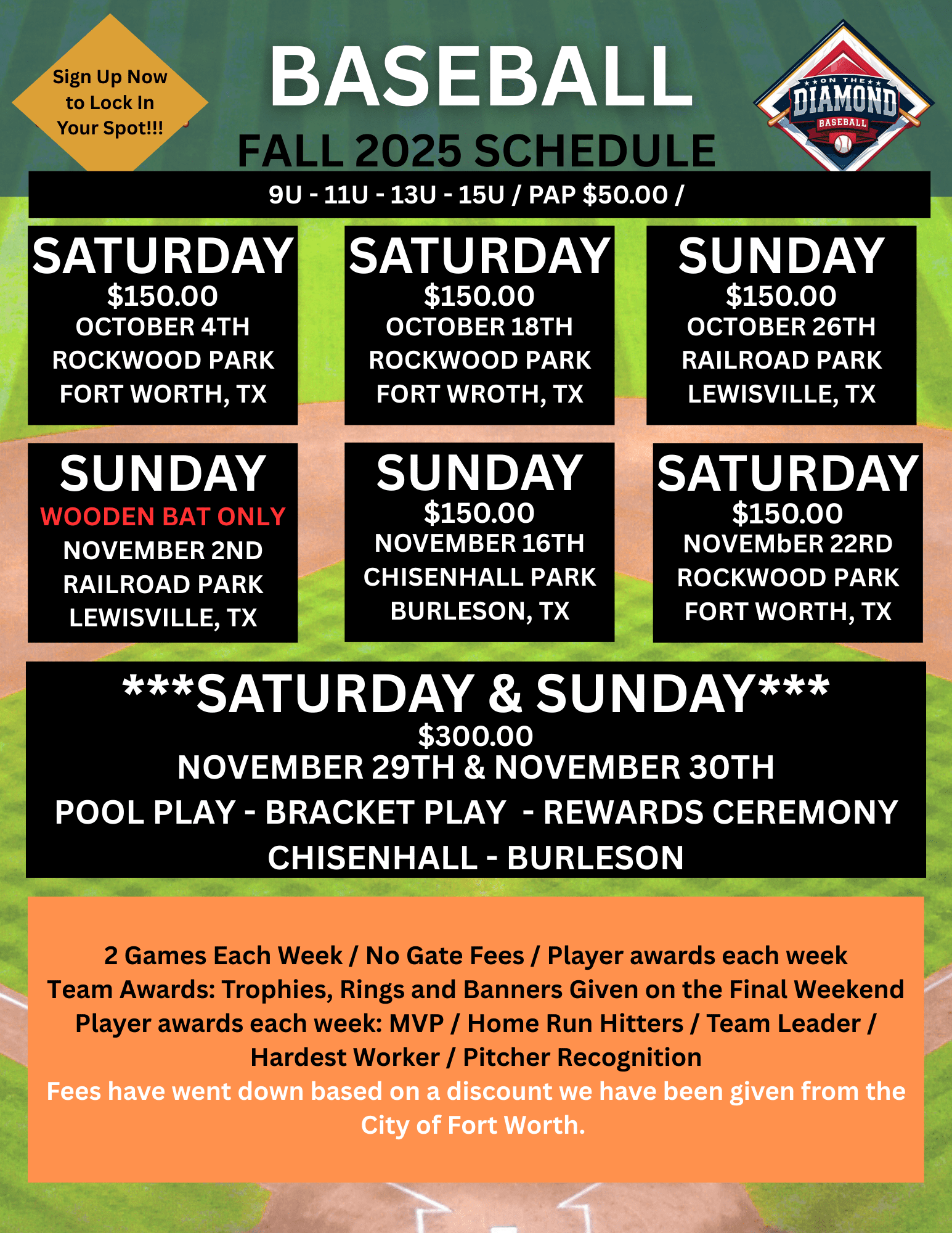 Register online at: https://events.onthediamondbaseball.com/ Or contact us at (817)776-6267