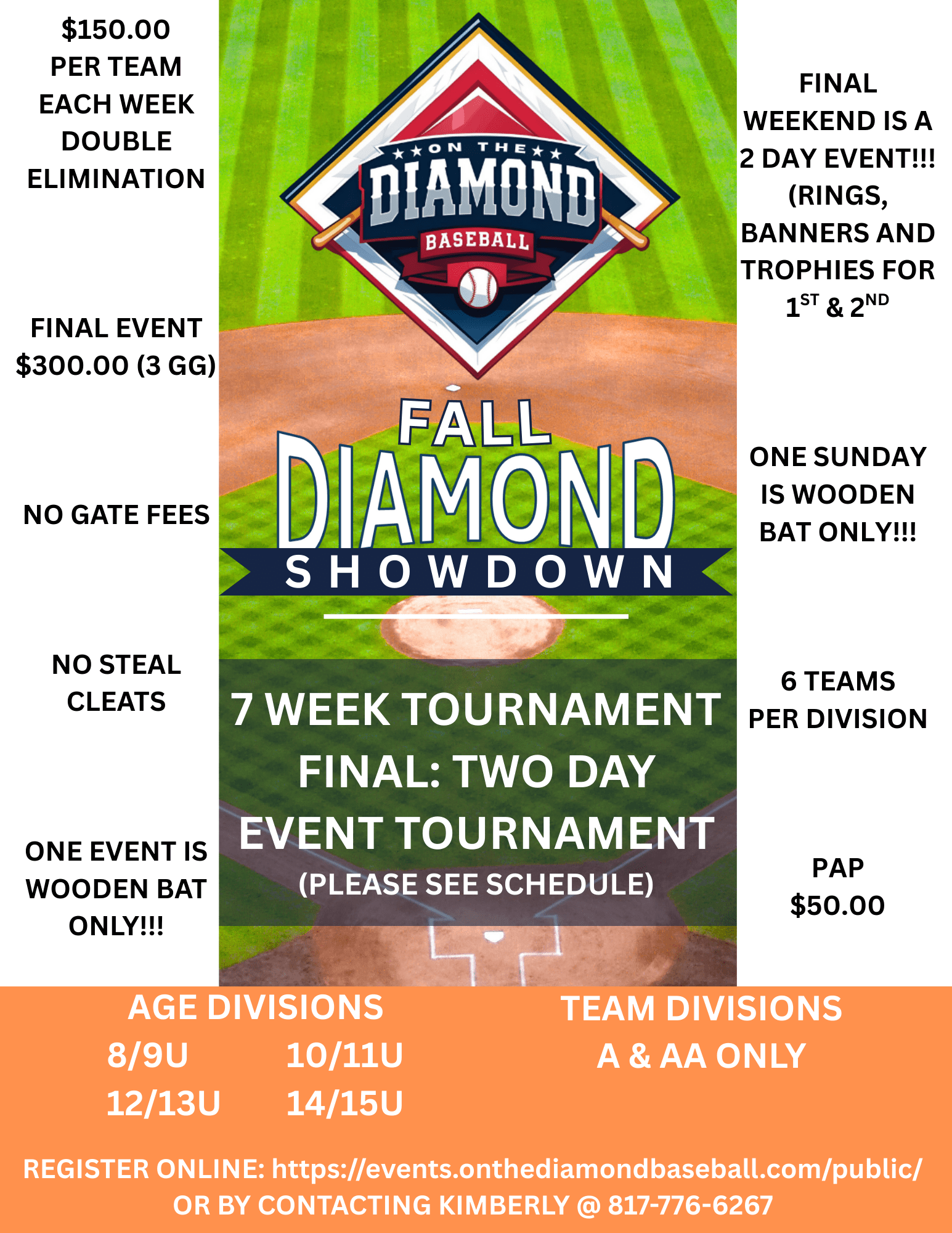 Register online at: https://events.onthediamondbaseball.com/ Or contact us at (817)776-6267